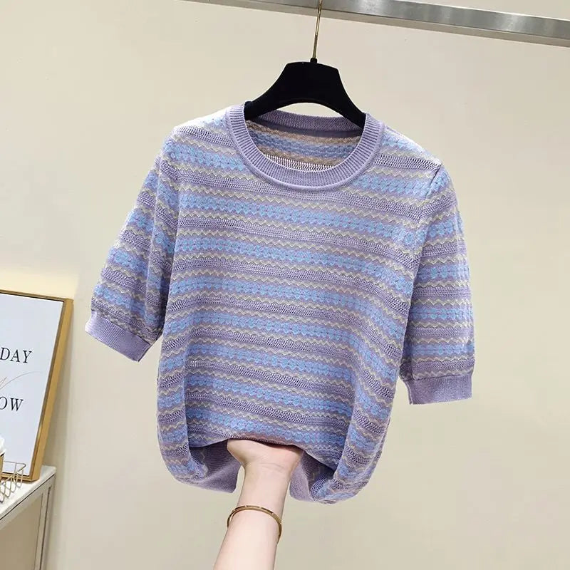 Embrace the perfect blend of comfort and style with this women's knitted t-shirt. Featuring a delicate, patterned knit, this short-sleeve top offers a relaxed fit, ideal for both casual outings and cozy days at home. The soft, breathable fabric ensures you stay comfortable while the elegant design keeps you looking effortlessly chic.