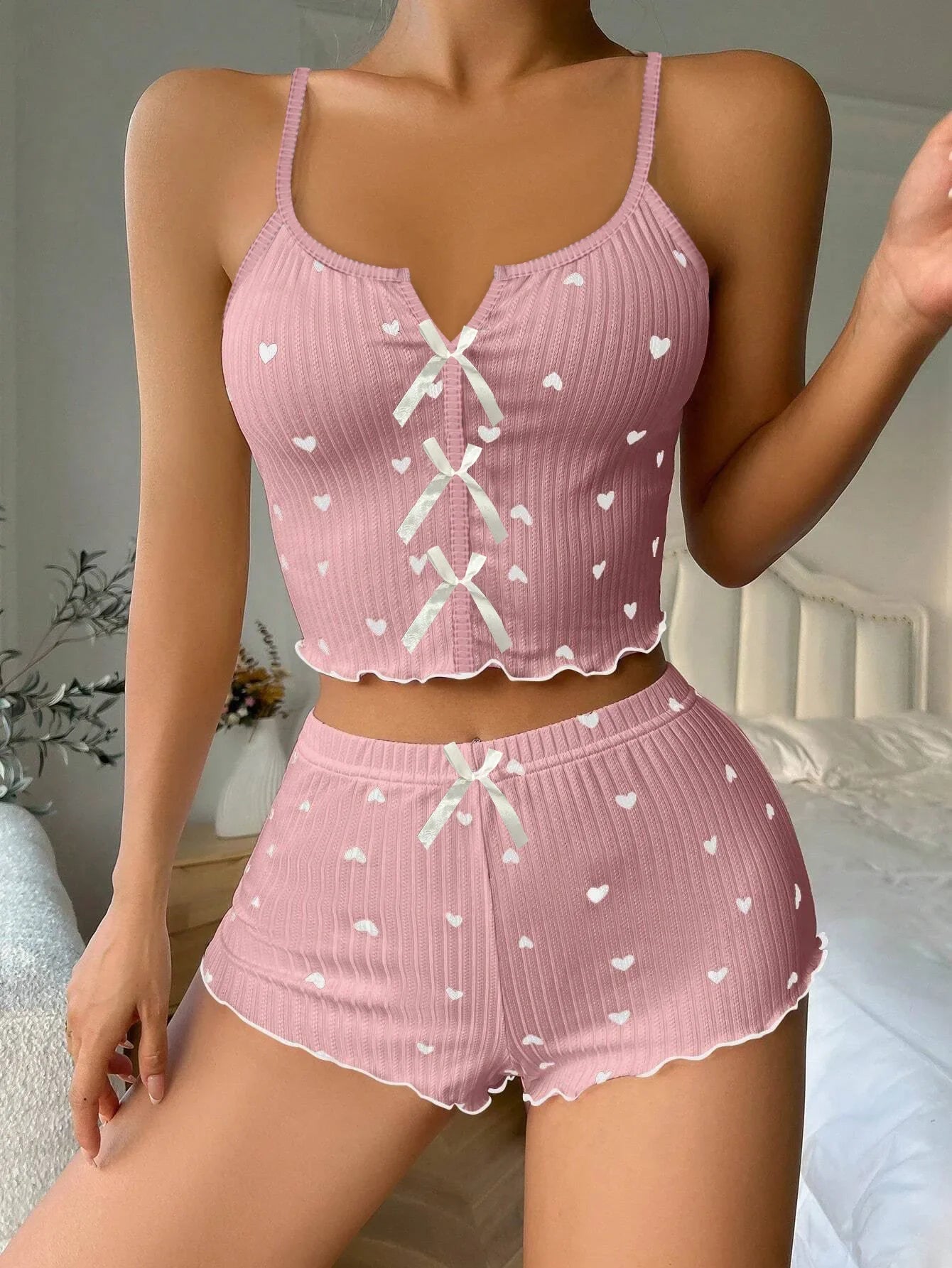 Introducing our adorable women's pajama set, designed for ultimate comfort and style. This charming set features a soft, ribbed fabric with delicate heart patterns and cute ribbon details, ensuring you look and feel great as you unwind. Perfect for lounging or a cozy night's sleep, this pajama set offers both a flattering fit and unparalleled comfort, making it a must-have addition to your nighttime wardrobe.