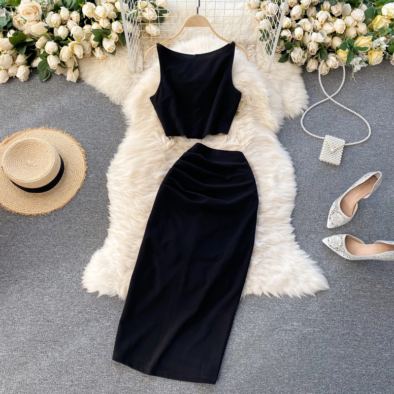 Slip into sleek sophistication with this skirt set featuring a sexy sleeveless tank top and a high-waisted slim skirt. It’s a chic ensemble perfect for turning heads at a cocktail party or enjoying an elegant night out.